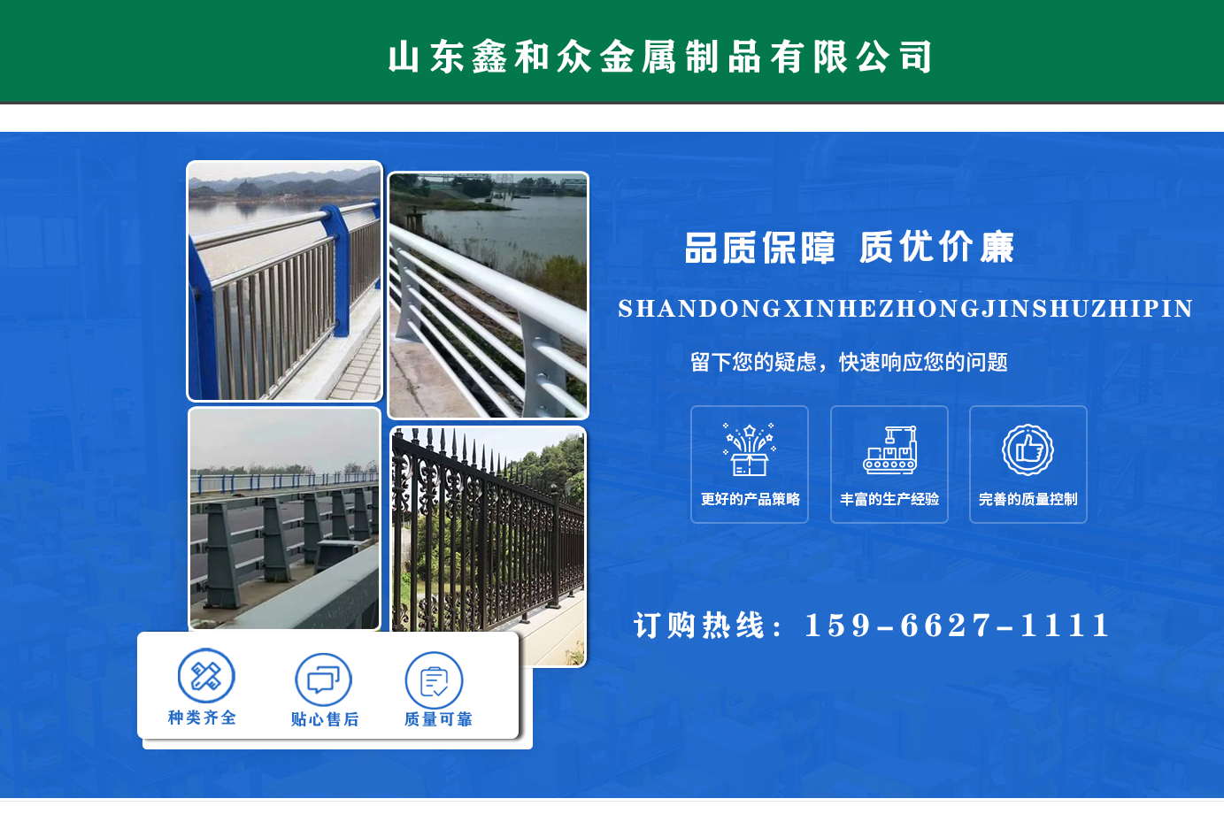 山東鑫和眾金屬制品有限公司主要產(chǎn)品有防撞護(hù)欄,橋梁護(hù)欄,道路護(hù)欄,河道護(hù)欄,不銹鋼護(hù)欄等護(hù)欄。提供設(shè)計(jì)方案,一站式定制,包您滿意價(jià)格優(yōu)惠,歡迎來電咨詢! 公司常年從事銷售護(hù)欄防撞護(hù)欄,橋梁護(hù)欄,道路護(hù)欄,河道護(hù)欄,不銹鋼護(hù)欄,橋梁鋼護(hù)欄,河道燈光護(hù)欄等。產(chǎn)品廣泛應(yīng)用于橋梁、河道、旅游景區(qū)、道路、公路、公園、小區(qū)、景觀、道路防撞等領(lǐng)域?! 」井a(chǎn)品均采用優(yōu)質(zhì)不銹鋼材料,符合相關(guān)標(biāo)準(zhǔn)。各種型號(hào)不銹鋼復(fù)合管及護(hù)欄,質(zhì)量嚴(yán)格把控。產(chǎn)品強(qiáng)度高、耐腐蝕、焊接牢固、抗沖擊、性能好,防撞護(hù)欄結(jié)構(gòu)簡單、美觀實(shí)用大方?! g迎前來訂購!...